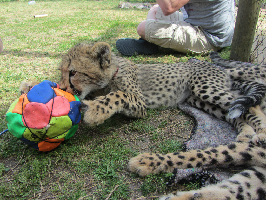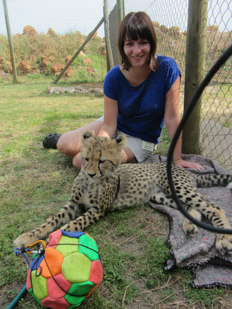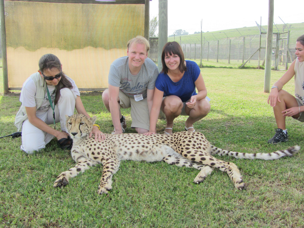 Na de lunch gingen we cheetahs aaien, een wens van Ingrid. Voor de baby cheetahs (cubs) moesten we zijn op Eikendal estate. Eerst reden we verkeerd via Eikendal winery, toen Eikendal Lodge en toen kwamen we via een zandweg bij Eikendal house waar de cheetahs waren. Na het reinigen van onze handen en het verruilen van onze schoenen van crocs mochten we 15 minuten bij de cheetahs. CUTE! We mochten ze aaien en dit vonden ze net zo fijn als Bobby en Grover en ze deden PRRRRRR!