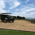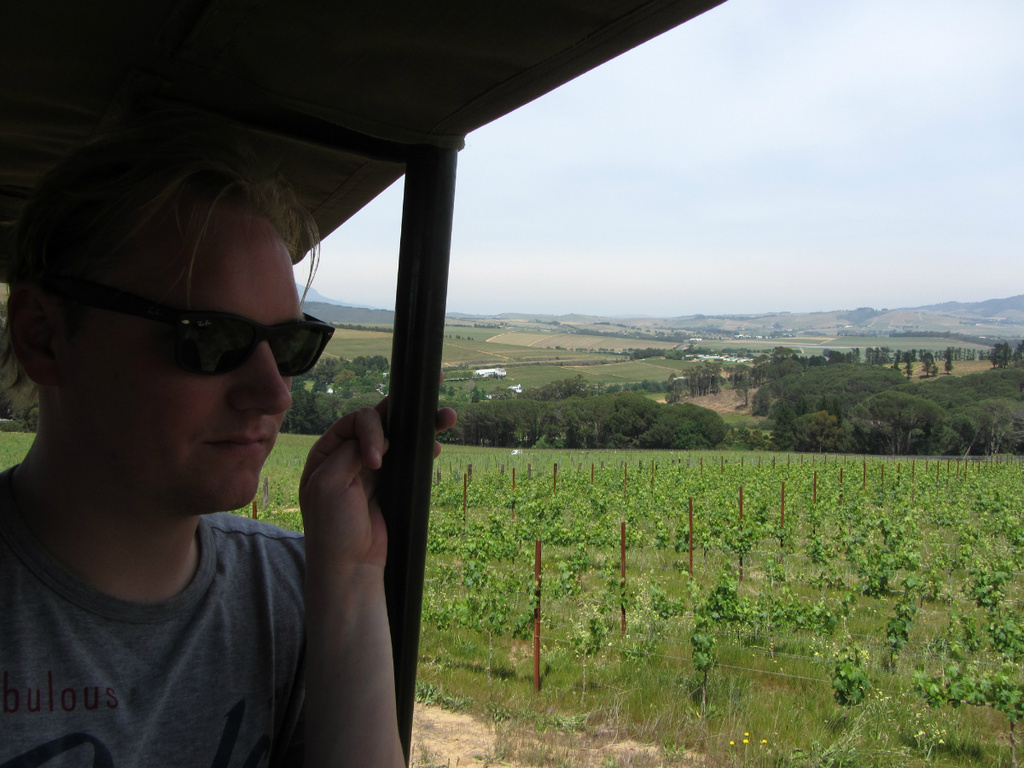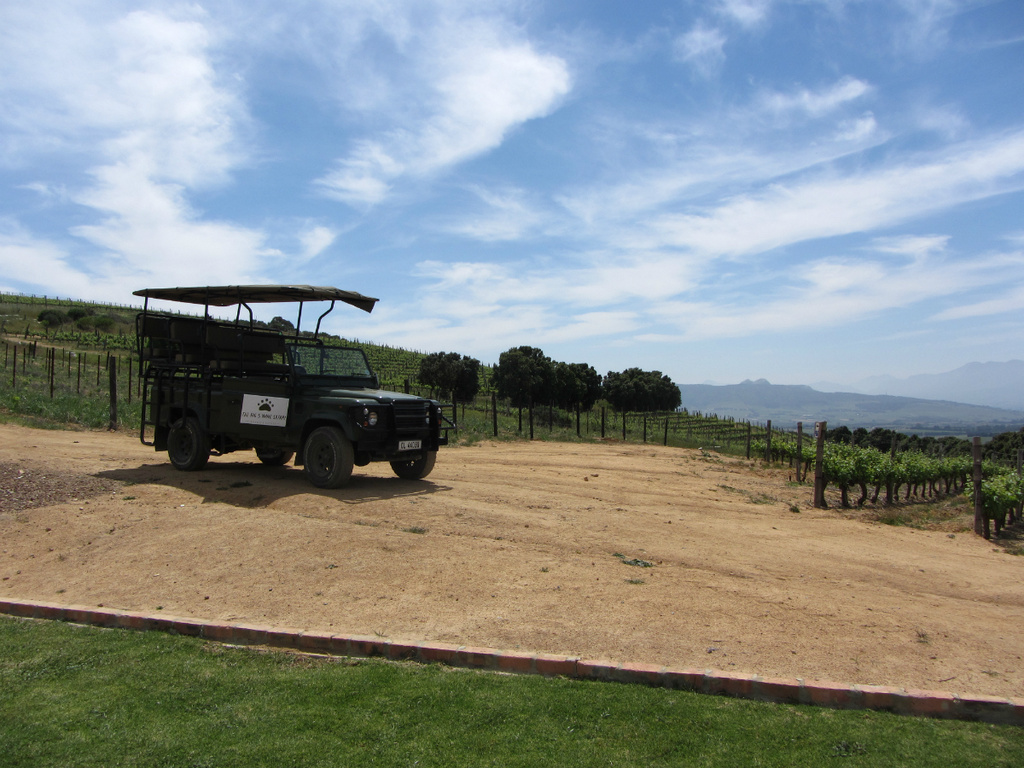 Het estate was een plaatje. We namen plaats op het terras voor de tasting, 2 wit, 3 rood. Wat ons betreft hadden de wijnen wat langer mogen rijpen, deze waren te jong naar onze smaak. Na het proeven gingen stapten we in de jeep voor de safari. Gids Lawrence tourde met ons over de vele wijnvelden, liet zien waar de druiven groeiden en legde uit hoe ze de druiven verzorgen. Bovenop de wijngaard hadden we een zeer uitgerestrekt uitzicht over de wijngaarden en Stellebosch. We toosten hier op het goede leven met een Sauvignon Blanc.