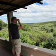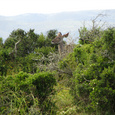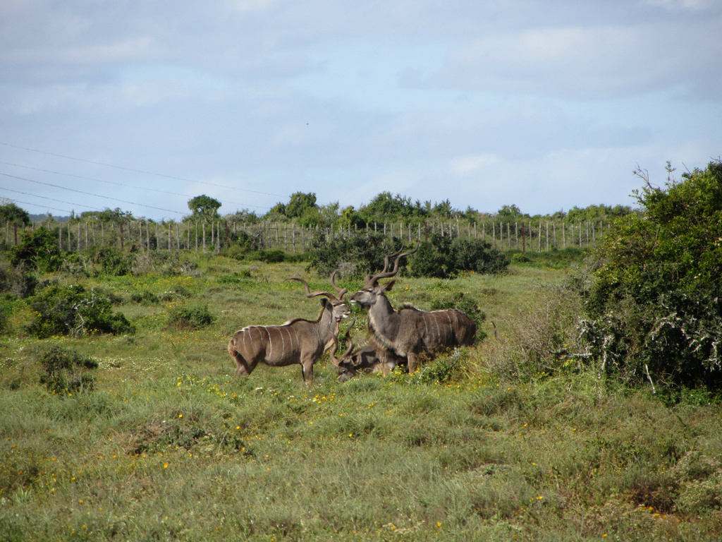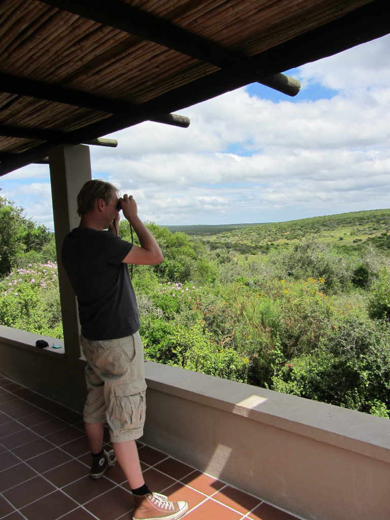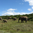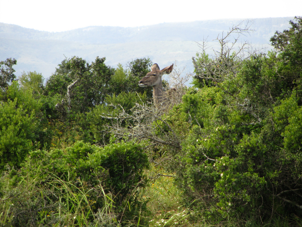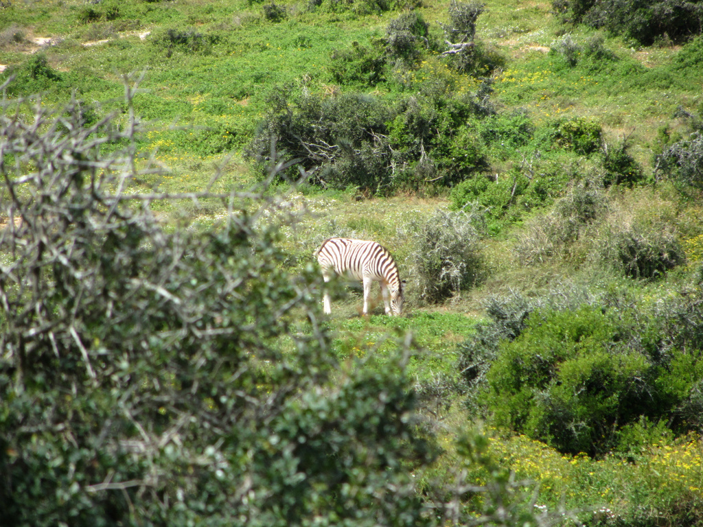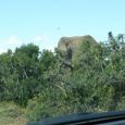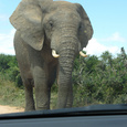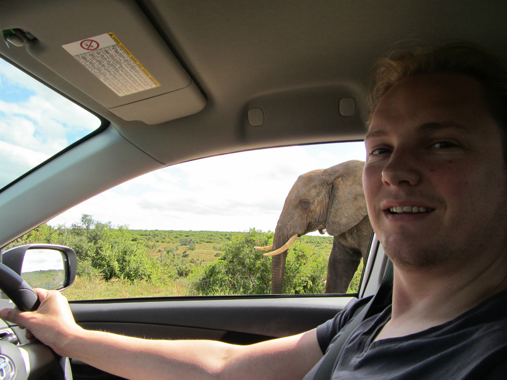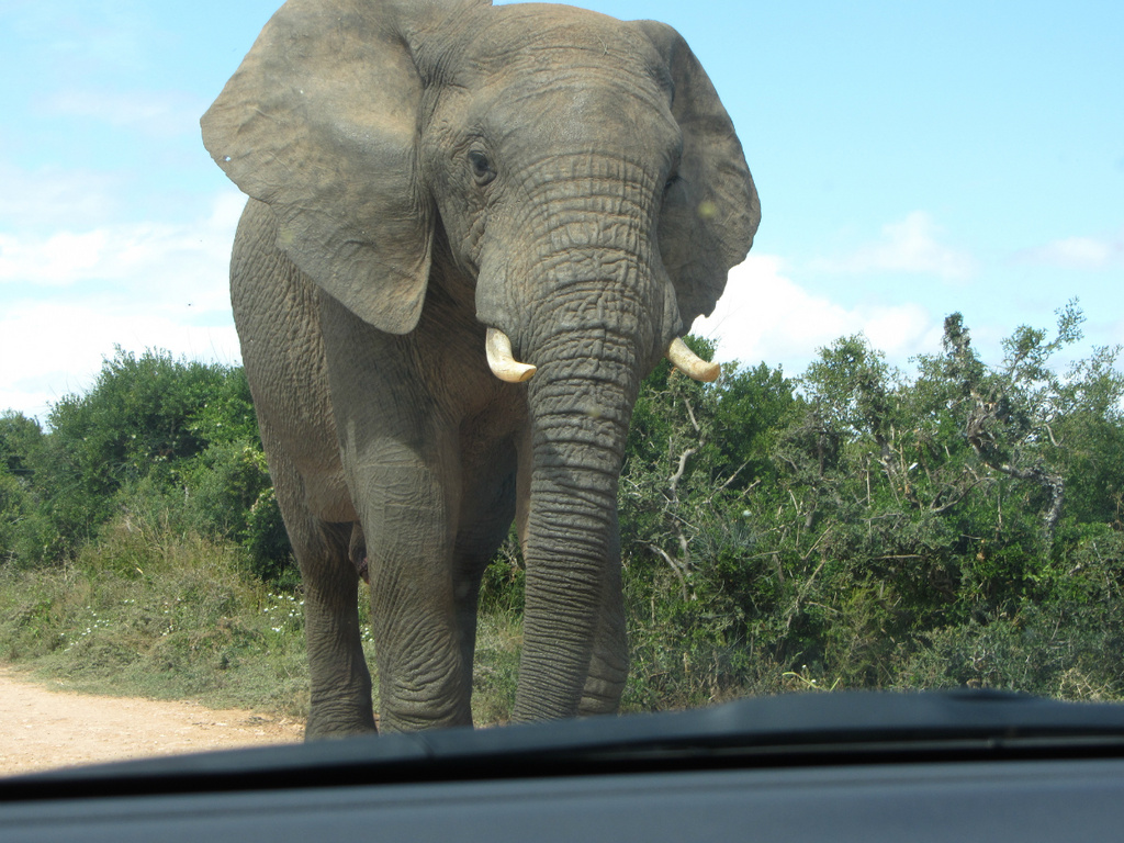 Rond het middaguur kwamen we aan bij de receptie van Addo. Hier ontstond wat verwarring, ze wilden een voucher en die hadden we niet. Een kopie van ons reisschema voldeed gelukkig ook. De sleutel van onze cottage konden we om 1 uur ophalen, dus eerst even lunchen in het park restaurant. Om 1 uur haalden we sleutel op en reden we naar onze cottage. Howel dit een budgetaccomodatie is, zijn wij helemaal gek op ons huisje. Het is een 2 onder 1 kapper met een keukentje, badkamer (met bad en douche), bed en het belangrijkste: een terras met wijds uitzicht over het park. Na het overhevelen van de bagage uit de kofferbak, inde cottage, vertrokken we naar de game area om wild te gaan spotten. Het eerste half uur moesten we er nog een beetje inkomen,wennen aan de weg, route bepalen en genieten van het landschap: dit is safari! En toen zag Ingrid het eerste zebra duo bij een waterplas. Raampje, point and shoot en vastgelegd met de camera voor het leven (en de blog). Gaaf gevoel, ons eerste game gespot! Hierna bleef het weer een half uur rustig, we waren het voor onszelf al aan het goedpraten met 'de omgeving is ook mooi', 'morgenochtend zien we vast meer', 'vette zandweg, wat een safari' toen Ingrid plots riep 'EEN OLIFANT!' Ramon schrok, ging op de rem en toen zagen we een enorme olifant uit de bush komen. Langzaam reden we dichterbij en openden we het raampje. De olifant liep vlak langs de auto, een geweldig moment, maar ook een beetje eng volgens Ingrid. In extase reden we verder onze route. Een echte wilde Afrikaanse olifant, hoe gaaf! Dit is Afrika! Bij de volgende waterplek hadden we nogmaals beet. Wel 15 olifanten, mannetjes, vrouwtjes en kleintjes liepen in een kudde bij de waterpoel. Ze waren al aan het vertrekken en liepen achter elkaar over de weg. Een geweldig schouwspel waar slechts 3 auto getuigen van waren. Hierna reden we terug naar ons huisje voor een kleine pauze en recharge momentje. Rond 3 uur gingen we weer de game area in en onze ogen waren inmiddels getrained. We spotten kudos, herten, schildpadden, kevers zebra's en weer een olifant. Een mooi resultaat op onze eerste dag! Om 6 uur sloot de game area en gingen wij aan tafel bij het restaurant. Ramon had een ietwat taaie kudo (smaakt naar biefstuk) en Ingrid een heerlijke Afrikaanse bobotti. Nu op tijd naar bed. Morgen zetten we de wekker om half 6 om de bush te zien ontwaken en nog wat dieren te spotten. Hierna rijden we door naar Port Elizabeth voor onze binnelandse vlucht (15:10 uur) naar Durban. Met onze nieuwe huurauto rijden we dan door naar een kustplaatsje bij Durban: Ballito. Hier blijven we 2 nachtjes om weer een beetje op adem te komen.